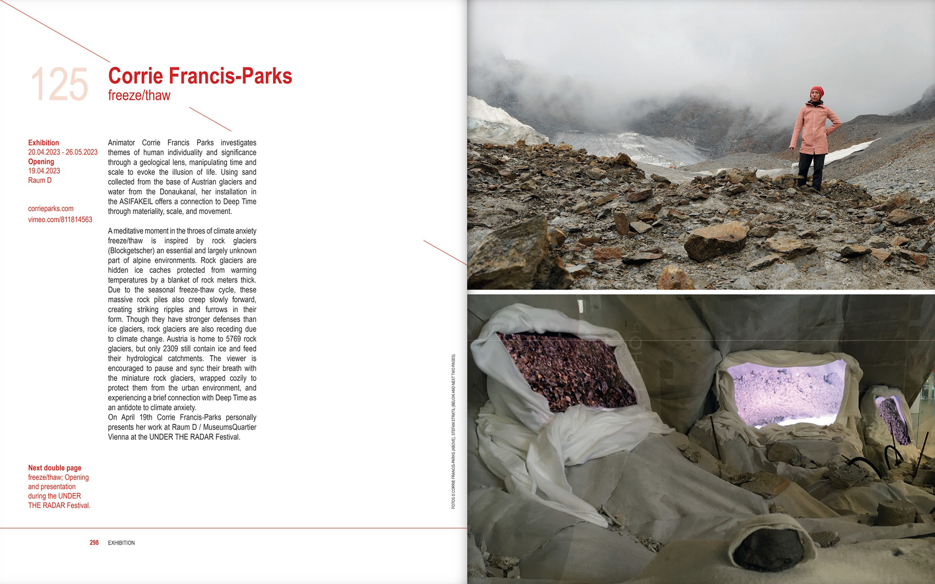 The work was first conceived and realized for the Asifakeil at the Musuemsquartier in Vienna, Austria. The installation uses sand and sediments collected from two rock glaciers and one glacier in the Austrian alps, all of which are part of the Danube river catchment. Austria is home to 5769 rock glaciers, but only 2309 still contain ice and feed their hydrological catchments. During my Fulbright/Q21 residency at the Museumsquartier in Vienna, I infused these sediments with frozen water from the Danube to create miniature rock glaciers. Using a technique practiced on economically significant glaciers at ski areas, I wrap these miniature rock glaciers in synthetic blankets as a way of protecting them from anthropogenic influence and record their freeze/thaw cycles as a way of translating a Deep Time phenomenon into more visible Human Time. The resulting videos are complimented with sound design by Baltimore artist Maksym Prykhodko and installed as a response to the architecture of the space. Despite their fragility, these miniature rock glaciers find an uneasy equilibrium in the urban environment, offering viewers a moment to pause and sync their breath with the natural alpine cycles as transitory antidote to climate anxiety.