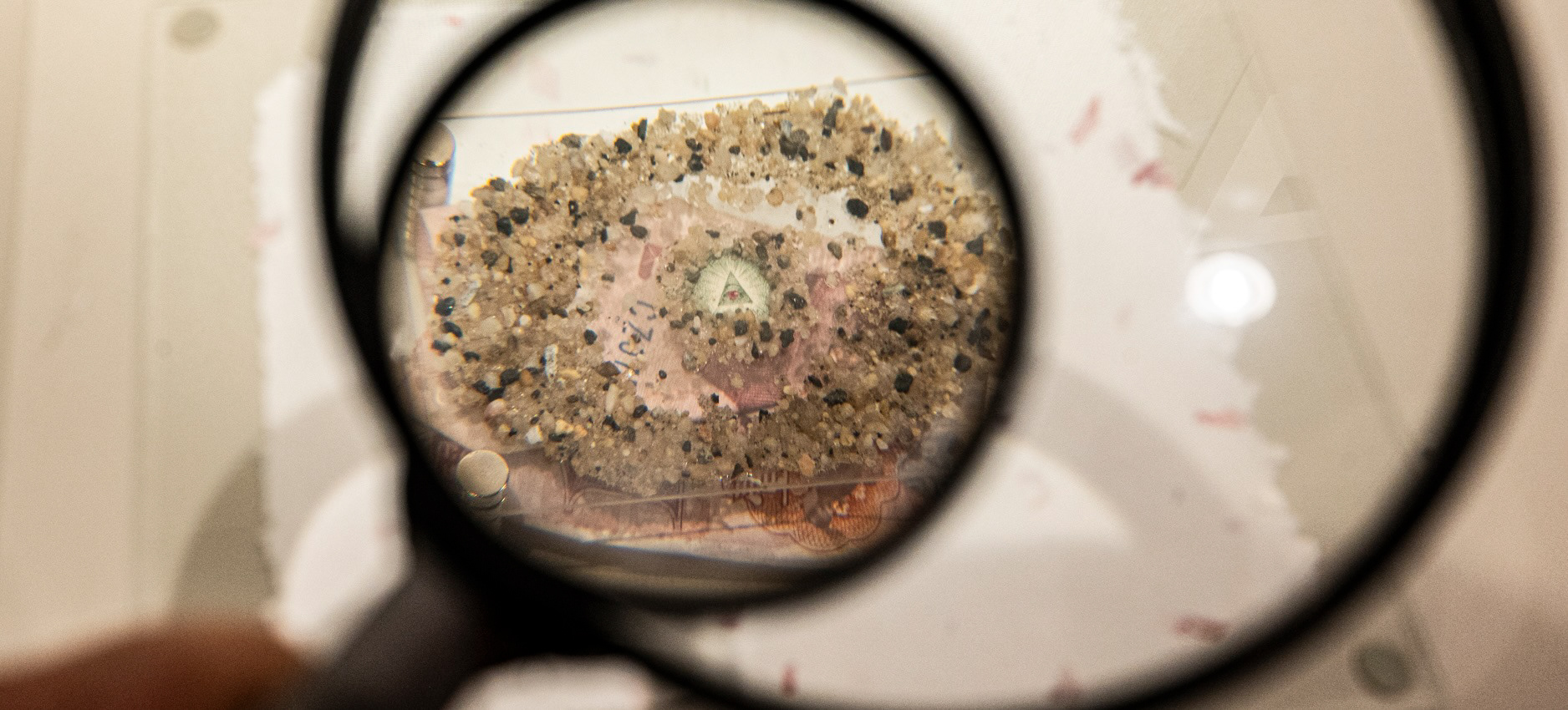 Eye of Providence, (2025, currency, sand, glass, handmade paper)
