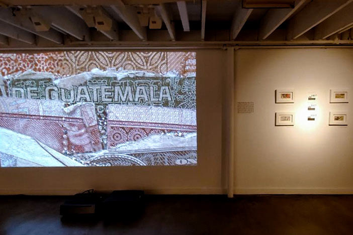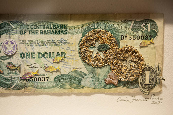 Foreign Exchange explores the tenuous connections and reinventions that keep the global economic tides flowing through banknotes and sand from over 50 countries. Building upon her unique practice of micro-sand animation, in which the individual grains of sand take on a life of their own, Parks expands the work into the gallery with currency collages and artifacts from the film’s production.